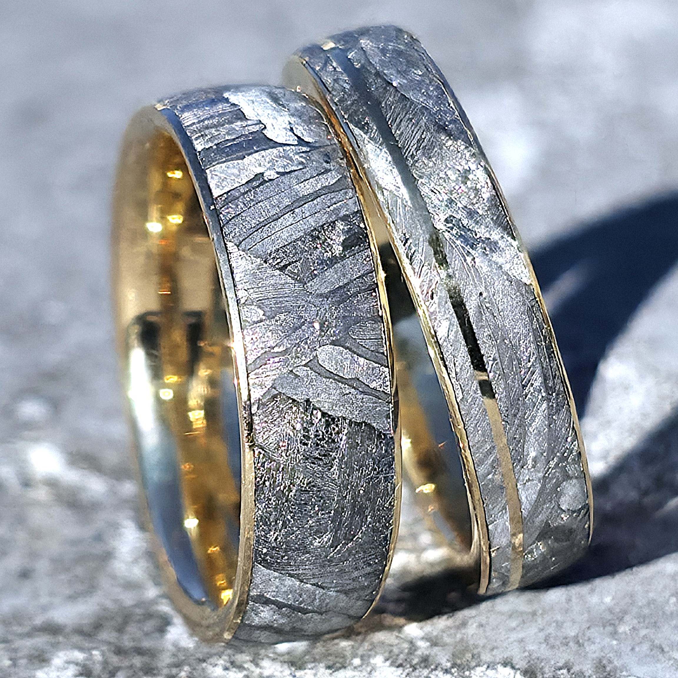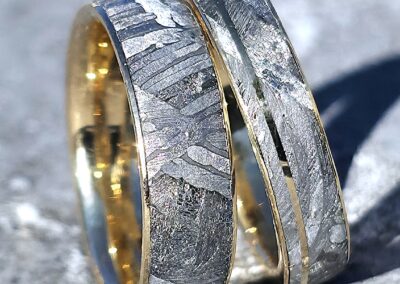 Mes modèles phares, créés régulièrement dans mon atelier. Chaque pièce conserve l’unicité de l’acier de Damas avec ses motifs impossibles à reproduire ou ou l’extraordinaire rareté de la météorite, cette matière spatiale aux propriétés uniques qui fait de chaque bijou une pièce cosmique d’exception. Personnalisables selon votre taille et vos préférences de matériaux.