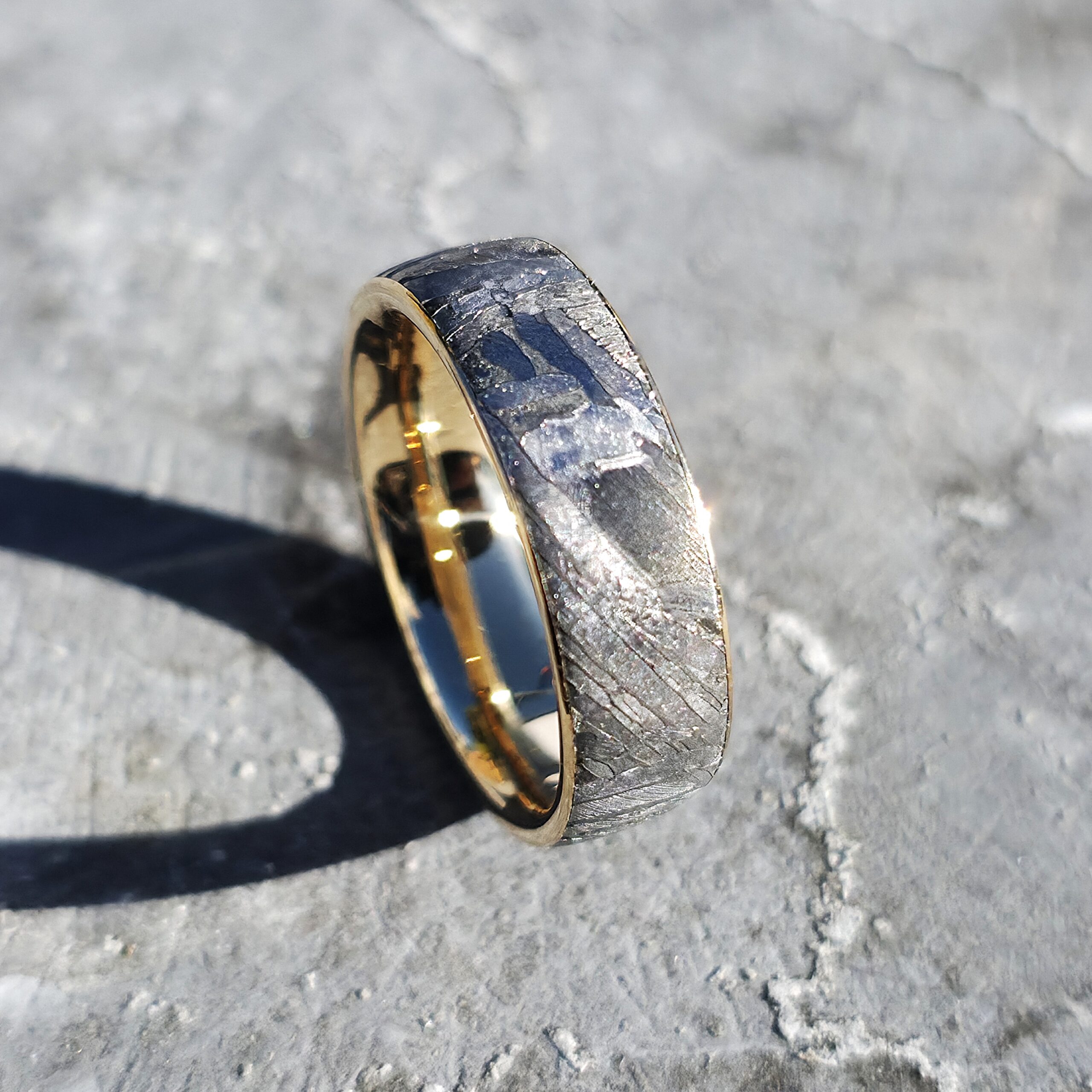 Nous façonnons cette bague à partir de météorites de la famille des octaédrites, un fragment cosmique vieux de plusieurs millions d’années. Elle dévoile les célèbres motifs de Widmanstätten, une cristallisation extrêmement lente hors atmosphère. Nous intégrons cette météorite dans un intérieur et des bords en Or 18K. Notre savoir-faire consiste à assembler et façonner ces matériaux rares et exigeants pour garantir une robustesse exceptionnelle. Chaque bague sera réalisée sur mesure dans notre atelier Landais, selon vos choix de largeur, de Damas et de couleurs d’Or.